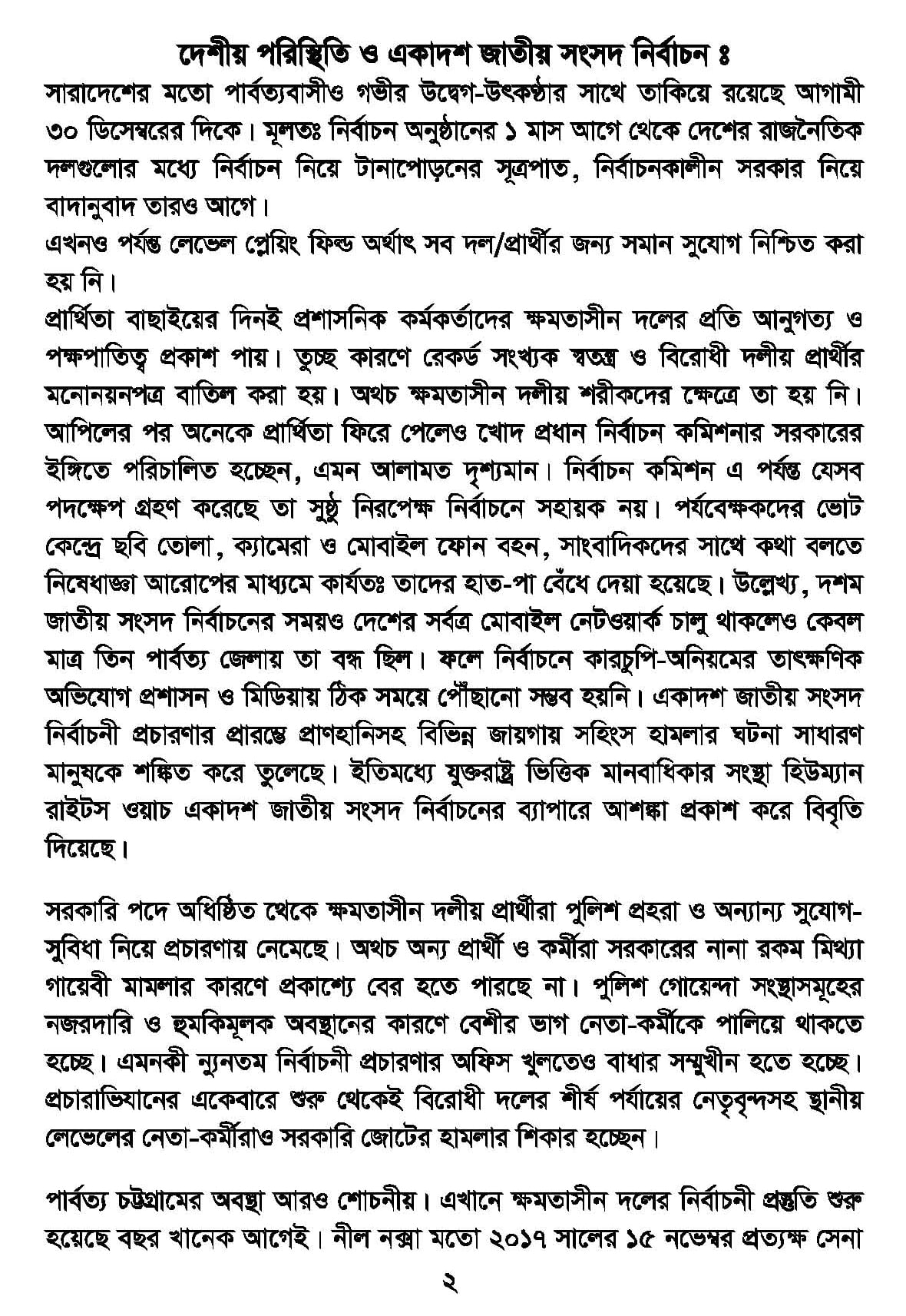 ২৯৮ নং খাগড়াছড়ি আসনের ‘একাদশ জাতীয় সংসদ নির্বাচন পরিচালনা ও সমন্বয় কমিটি কমিটি’ কর্তৃক প্রকাশিত ৮ পৃষ্ঠার ইশতেহারে পার্বত্য চট্টগ্রামসহ সারাদেশে নির্বাচনের লেভেল প্লেয়িং ফিল্ড তৈরি না হওয়ায় সুষ্ঠু, অবাধ ও নিরপেক্ষ নির্বাচন অনুষ্ঠান নিয়ে উদ্বেগ ও আশঙ্কা প্রকাশ হয়।