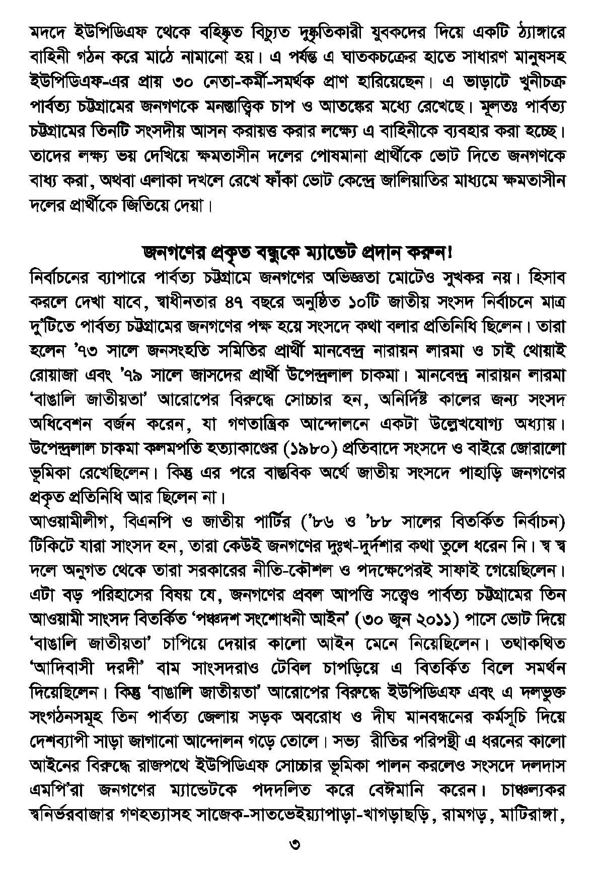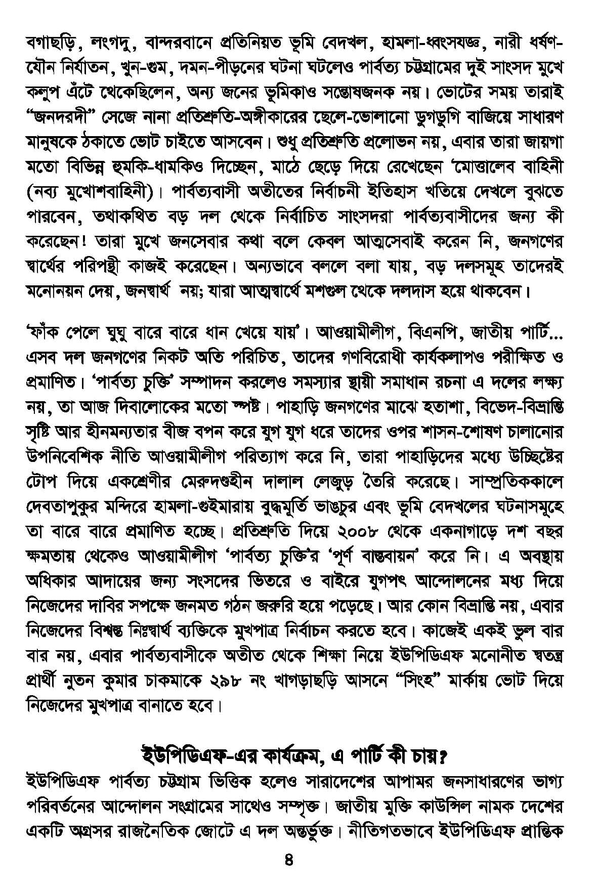 জনগণের প্রকৃত মুখপত্র নির্বাচনের আহ্বান জানিয়ে ইশতেহারে বলা হয়, আওয়ামীলীগ, বিএনপি, জাতীয় পার্টি… এসব দল জনগণের নিকট অতি পরিচিত, তাদের গণবিরোধী কার্যকলাপও পরীক্ষিত ও প্রমাণিত। ‘পার্বত্য চুক্তি’ সম্পাদন করলেও সমস্যার স্থায়ী সমাধান রচনা এ দলের লক্ষ্য নয়, তা আজ দিবালোকের মতো স্পষ্ট। পাহাড়ি জনগণের মাঝে হতাশা, বিভেদ-বিভ্রান্তি সৃষ্টি আর হীনমন্যতার বীজ বপন করে যুগ যুগ ধরে তাদের ওপর শাসন-শোষণ চালানোর উপনিবেশিক নীতি আওয়ামীলীগ পরিত্যাগ করে নি, তারা পাহাড়িদের মধ্যে উচ্ছিষ্টের টোপ দিয়ে একশ্রেণীর মেরুদ-হীন দালাল লেজুড় তৈরি করেছে। সাম্প্রতিককালে দেবতাপুকুর মন্দিরে হামলা-গুইমারায় বুদ্ধমূর্তি ভাঙচুর এবং ভূমি বেদখলের ঘটনাসমূহে তা বারে বারে প্রমাণিত হচ্ছে। প্রতিশ্রুতি দিয়ে ২০০৮ থেকে একনাগাড়ে দশ বছর ক্ষমতায় থেকেও আওয়ামীলীগ ‘পার্বত্য চুক্তি’র ‘পূর্ণ বাস্তবায়ন’ করে নি। এ অবস্থায় অধিকার আদায়ের জন্য সংসদের ভিতরে ও বাইরে যুগপৎ আন্দোলনের মধ্য দিয়ে নিজেদের দাবির সপক্ষে জনমত গঠন জরুরি হয়ে পড়েছে। আর কোন বিভ্রান্তি নয়, এবার নিজেদের বিশ্বস্ত নিঃস্বার্থ ব্যক্তিকে মুখপাত্র নির্বাচন করতে হবে।