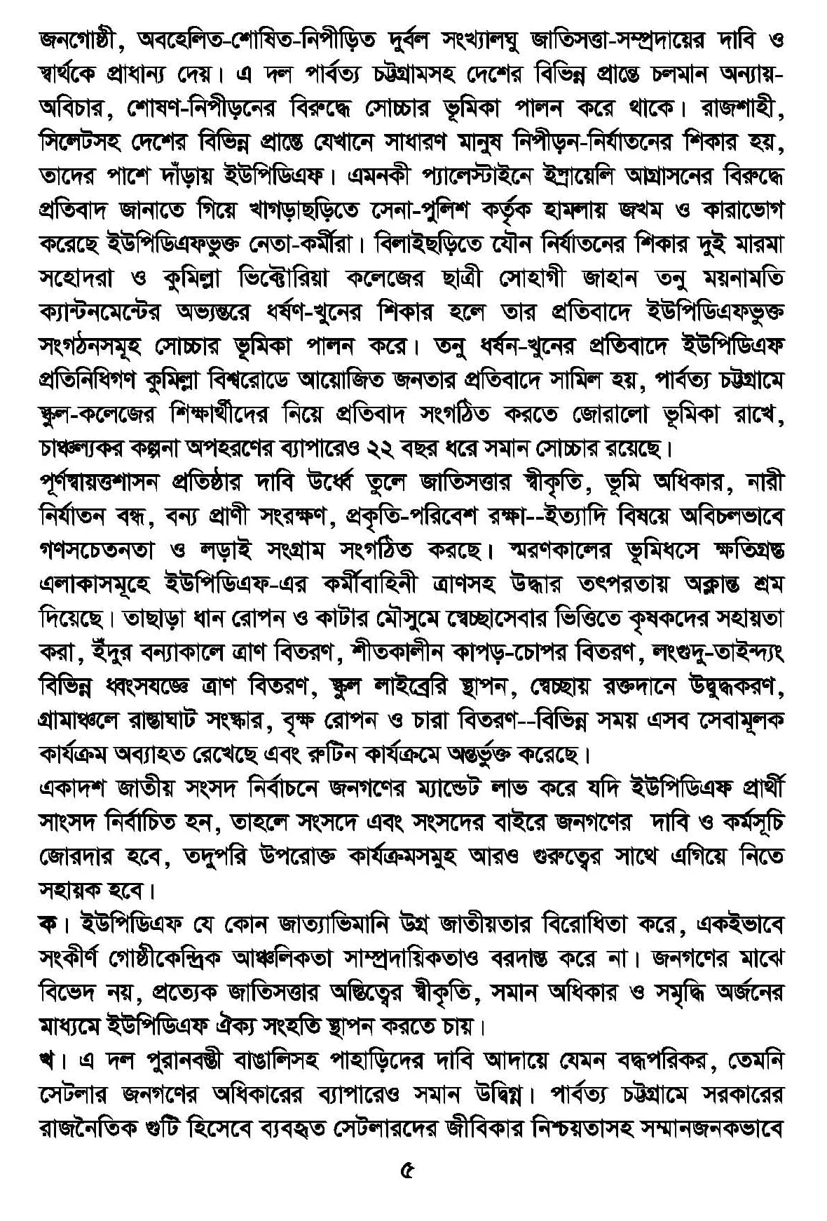 ক। ইউপিডিএফ যে কোন জাত্যাভিমানি উগ্র জাতীয়তার বিরোধিতা করে, একইভাবে সংকীর্ণ গোষ্ঠীকেন্দ্রিক আঞ্চলিকতা সাম্প্রদায়িকতাও বরদাস্ত করে না। জনগণের মাঝে বিভেদ নয়, প্রত্যেক জাতিসত্তার অস্তিত্বের স্বীকৃতি, সমান অধিকার ও সমৃদ্ধি অর্জনের মাধ্যমে ইউপিডিএফ ঐক্য সংহতি স্থাপন করতে চায়।