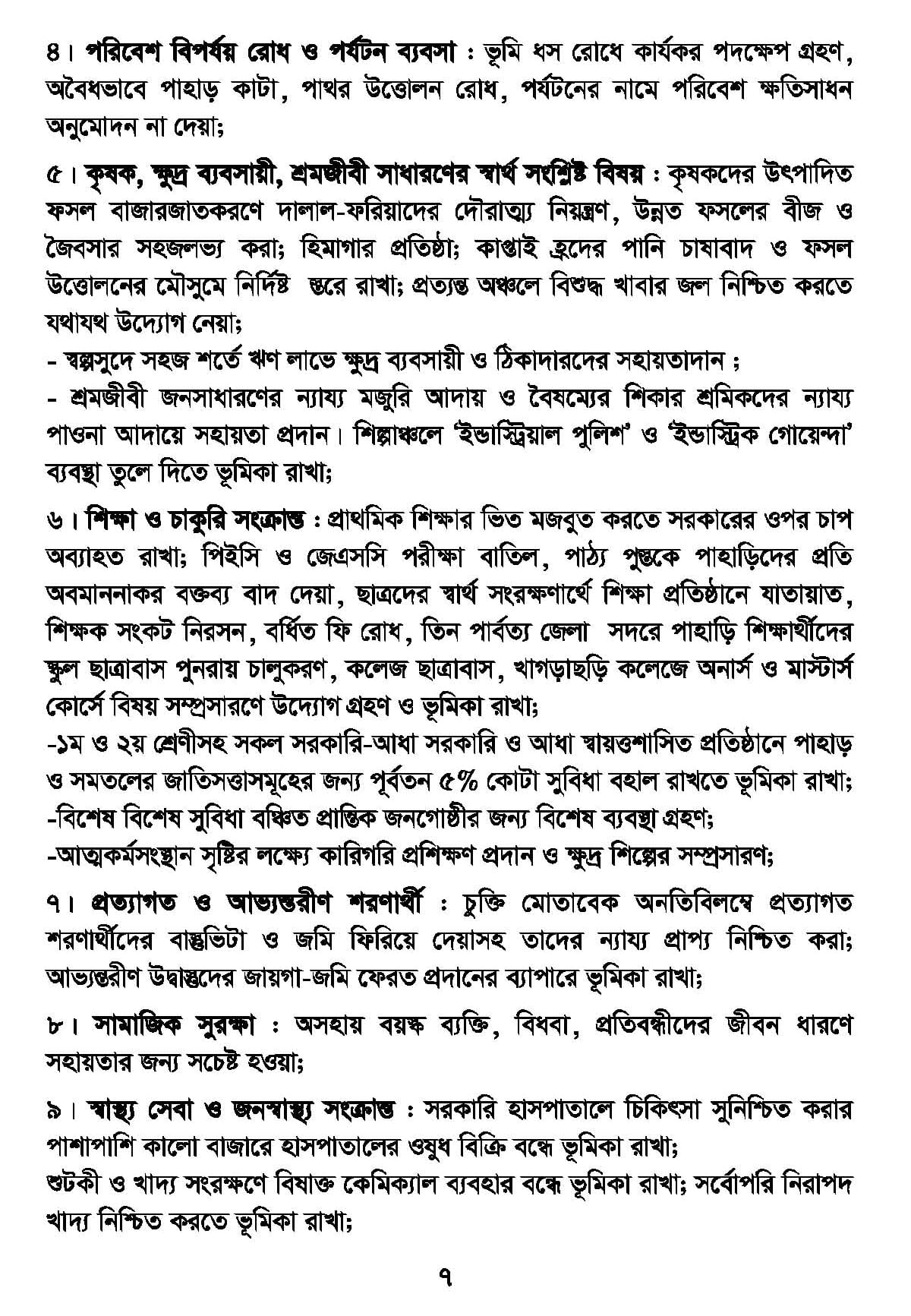 ৭। প্রত্যাগত ও আভ্যন্তরীণ শরণার্থী : চুক্তি মোতাবেক অনতিবিলম্বে প্রত্যাগত শরণার্থীদের বাস্তুভিটা ও জমি ফিরিয়ে দেয়াসহ তাদের ন্যায্য প্রাপ্য নিশ্চিত করা; আভ্যন্তরীণ উদ্বাস্তুদের জায়গা-জমি ফেরত প্রদানের ব্যাপারে ভূমিকা রাখা;