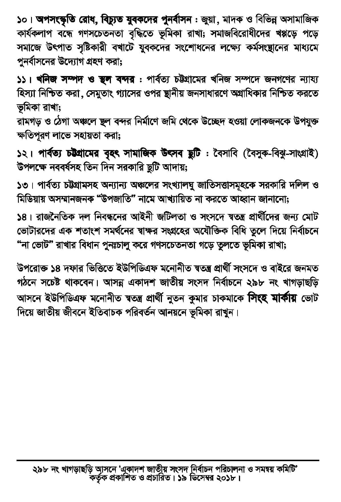 ইশতেহারে আগামী ৩০ ডিসেম্বর ২০১৮ অনুষ্ঠেয় নির্বাচনে সিংহ মার্কায় ভোট দিয়ে ইউপিডিএফ সমর্থিত স্বতন্ত্র প্রার্থী নুতন কুমার চাকমাকে বিজয়ী করে জাতীয় জীবনে ইতিবাচক পরিবর্তন আনয়নে ভূমিকা রাখার জন্য জনগণের প্রতি আহ্বান জানানো হয়েছে।