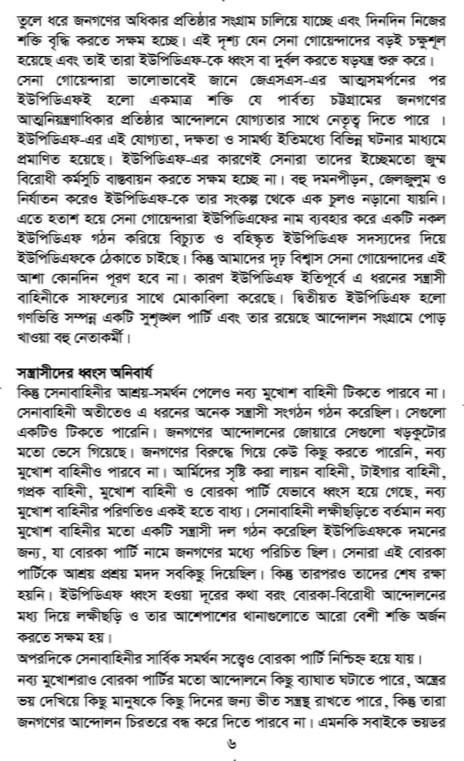 – ইউপিডিএফ ও তার সহযোগী সংগঠনের নেতাকর্মী, সমর্থক তথা সাধারণ জনগণের উপর দমন পীড়ন বন্ধ করুন; জনগণের ন্যায্য অধিকার মেনে নিন।
