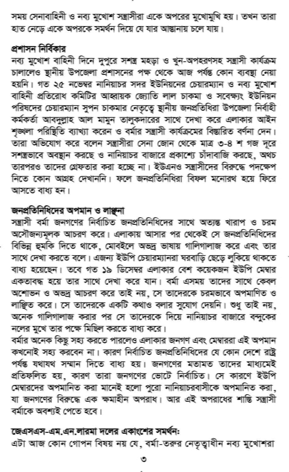 প্রশাসনের নির্বিকার ভূমিকার কথা উল্লেখ করে এতে বলা হয়, নব্য মুখোশ বাহিনী দিনে দুপুরে সশস্ত্র মহড়া ও খুন-অপহরণসহ সন্ত্রাসী কার্যক্রম চালালেও প্রশাসনের পক্ষ থেকে আজ পর্যন্ত কোন ব্যবস্থা নেয়া হয়নি।