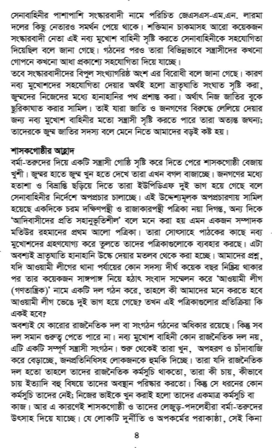 নব্য মুখোশ বাহিনী সেনাবাহিনীর সৃষ্টি উল্লেখ করে বুকলেটে বলা হয়, বর্মা-তরুর নেতৃত্বাধীন নব্য মুখোশ বাহিনীর সন্ত্রাসীরা হলো সেনাবাহিনীর সৃষ্টি। সেনাবাহিনীর অশ্রয়ে থেকে এবং তাদের মদদে ও পৃষ্ঠপোষকতায় তারা এসব জাতীয় স্বার্থ ও গণবিরোধী অপকর্ম করে বেড়াচ্ছে।