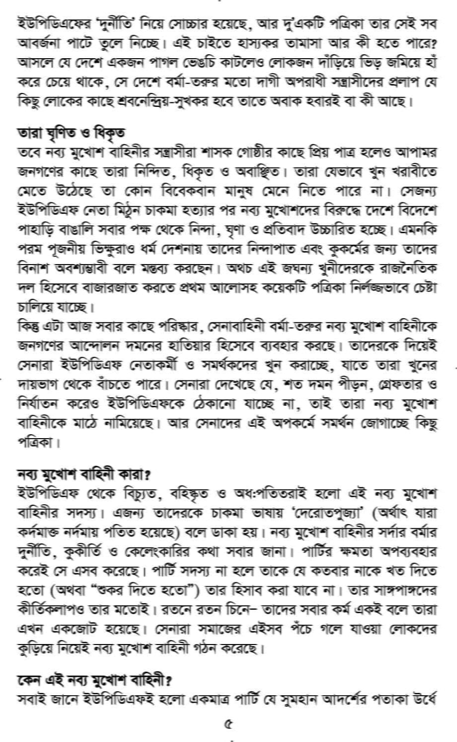 ইউপিডিএফ থেকে বিচ্যুত, বহিস্কৃত ও অধ:পতিতরাই হলো এই নব্য মুখোশ বাহিনীর সদস্য উল্লেখ করে বুকলেটে বলা হয় এজন্য তাদেরকে চাকমা ভাষায় ‘দেরোতপুজ্যা’ (অর্থাৎ যারা কর্দমাক্ত নর্দমায় পতিত হয়েছে) বলে ডাকা হয়। নব্য মুখোশ বাহিনীর সর্দার বর্মার দুর্নীতি, কুকীর্তি ও কেলেংকারির কথা সবার জানা। পার্টির ক্ষমতা অপব্যবহার করেই সে এসব করেছে। পার্টি সদস্য না হলে তাকে যে কতবার নাকে খত দিতে হতো (অথবা “শুকর দিতে হতো”) তার হিসাব করা যাবে না। তার সাঙ্গপাঙ্গদের কীর্তিকলাপও তার মতোই। রতনে রতন চিনে- তাদের সবার কর্ম একই বলে তারা এখন একজোট হয়েছে। সেনারা সমাজের এইসব পঁচে গলে যাওয়া লোকদের কুড়িয়ে নিয়েই নব্য মুখোশ বাহিনী গঠন করেছে।