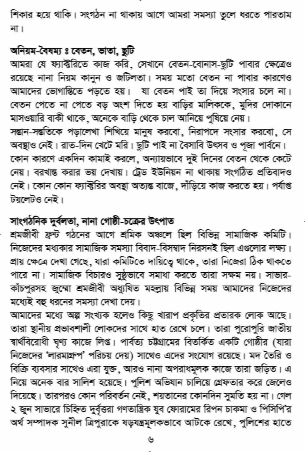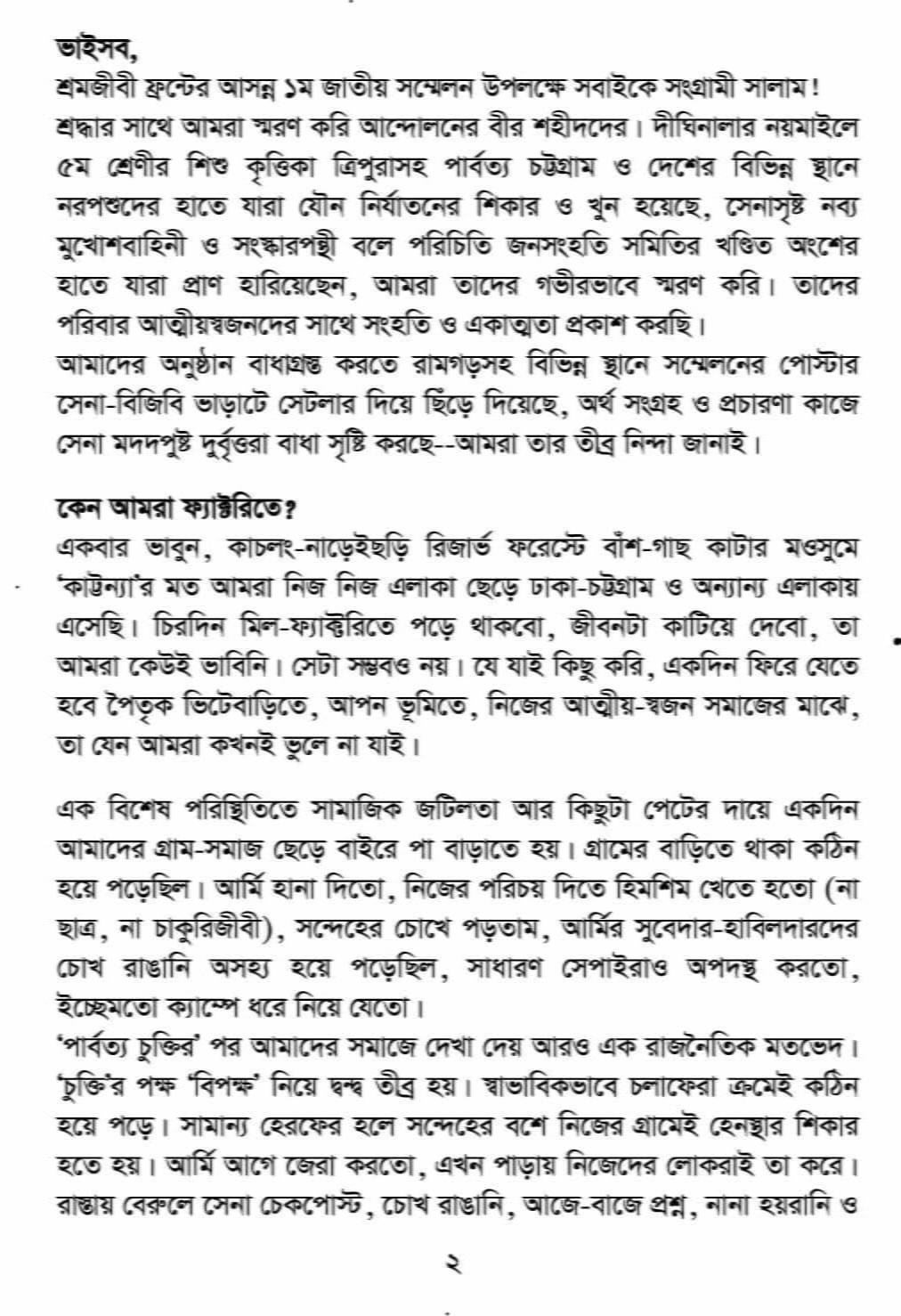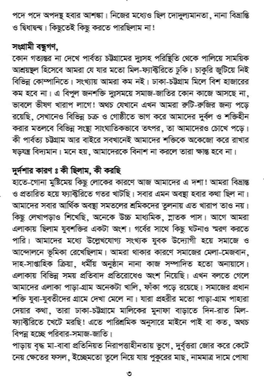 শুধু খেয়ে পরে বেঁচে থাকাই জীবন নয়, সমাজ-জাতি রক্ষার্থে ঐক্যবদ্ধ হোন- এই আহ্বানে ২ আগস্ট প্রকাশিত বুকলেটে ফ্যাক্টরিতে চাকরি জীবনের দুঃসহ চিত্র-অনিয়ম বৈষম্য, পার্বত্য চট্টগ্রামের দেশের সাম্প্রতিক পরিস্থিতিসহ নানা বিষয়ে তুলে ধরা হয়েছে।