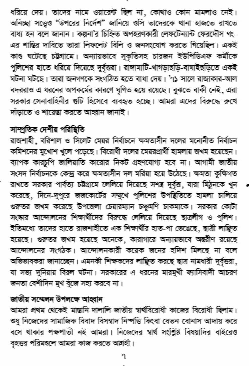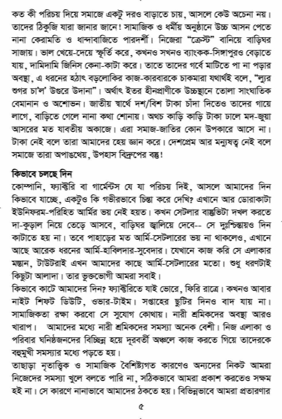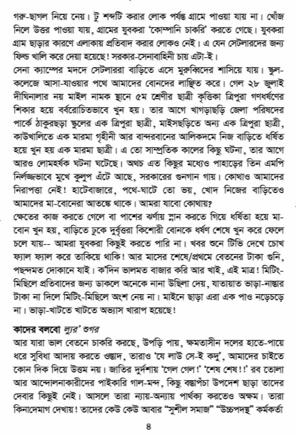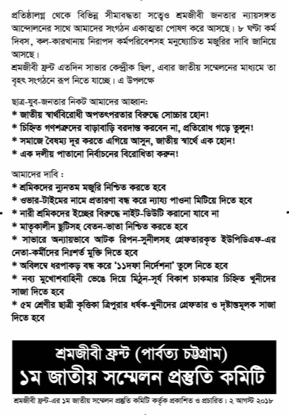 শুধু খেয়ে পরে বেঁচে থাকাই জীবন নয়, সমাজ-জাতি রক্ষার্থে ঐক্যবদ্ধ হোন- এই আহ্বানে ২ আগস্ট প্রকাশিত বুকলেটে ফ্যাক্টরিতে চাকরি জীবনের দুঃসহ চিত্র-অনিয়ম বৈষম্য, পার্বত্য চট্টগ্রামের দেশের সাম্প্রতিক পরিস্থিতিসহ নানা বিষয়ে তুলে ধরা হয়েছে।