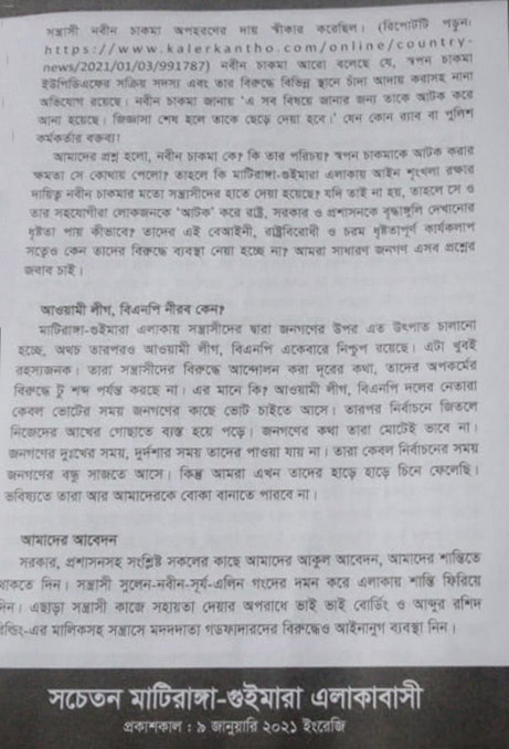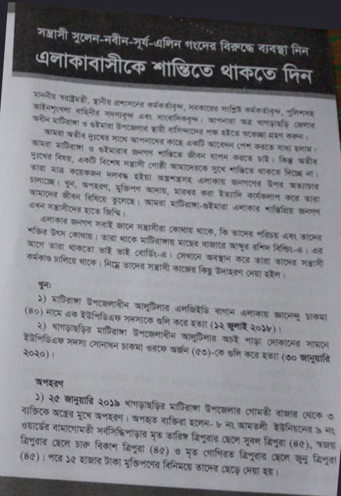 ‘সন্ত্রাসী সুলেন-নবীন-সূর্য-এলিন গংদের বিরুদ্ধে ব্যবস্থা নিন, আমাদেরকে শান্তিতে থাকতে দিন’ শিরোনামের উক্ত লিফলেটটি আমাদের হাতে এসেছে। পাঠকদের সুবিধার্থে লিফলেটটির গুরুত্বপূর্ণ অংশগুলো এখানে তুলে ধরা হলো: