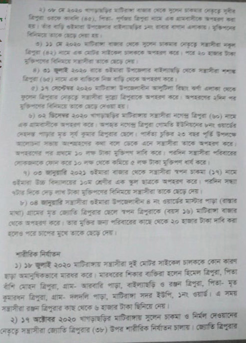সন্ত্রাসীরা ‘মাটিরাঙ্গায় মাছের বাজারে আব্দুর রশিদ বিল্ডিং-এ অবস্থান করে তাদের সন্ত্রাসী কর্মকান্ড চালিয়ে থাকে’ উল্লেখ করে লিফিলেটে কিছু সন্ত্রাসী কর্মকাণ্ডের তথ্য তুলে ধরা হয়। এতে বলা হয়, ‘২০১৮ সাল থেকে সন্ত্রাসীদের দ্বারা দুই ইউপিডিএফ সদস্য খুন, ১০ জন গ্রামবাসী অপহরণ, ৪ জন গ্রামবাসী শারীরিক নির্যাতনের শিকার হয়েছেন’। এছাড়াও সন্ত্রাসীরা জনগণকে নিয়মিত ভয়ভীতি প্রদর্শন ও জীবননাশসহ বিভিন্ন হুমকি দিয়ে থাকে এবং তারা ছিনতাইয়ের সাথেও জড়িত রয়েছে বলে লিফলেটে উল্লেখ করা হয়েছে।
