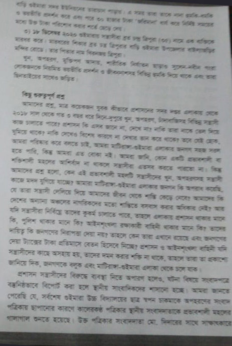 লিফলেটে সরকার, প্রশাসনসহ সংশ্লিষ্ট সকলের কাছে সন্ত্রাসীদের বিরুদ্ধে ব্যবস্থা গ্রহণের দাবি জানিয়ে বলা হয়, ‘আমাদের শান্তিতে থাকতে দিন। সন্ত্রাসী সুলেন-নবীন-সূর্য-এলিনগংদের দমন করে এলাকায় শান্তি ফিরিয়ে দিন। এছাড়া সন্ত্রাসী কাজে সহায়তা দেয়ার অপরাধে ভাই ভাই বোর্ডিং ও আব্দুর রশিদ বিল্ডিং-এর মালিকসহ সন্ত্রাসে মদদদাতা গডফাদারদের বিরুদ্ধেও আইনানুগ ব্যবস্থা নিন’।