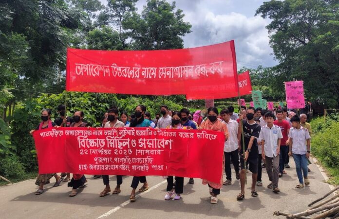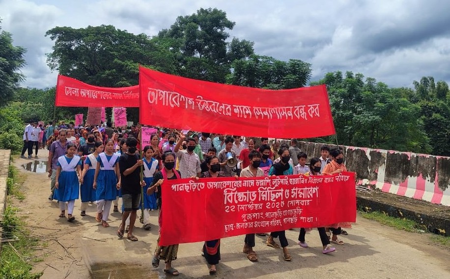 A protest march and rally were held in Panchari, Khagrachari, demanding an end to house raids, looting, harassment, and torture carried out under the pretext of military operations.