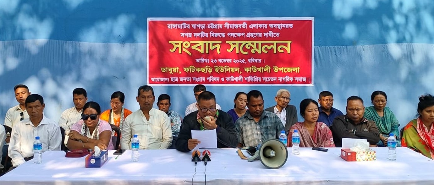 Ushaton Chakma, President of the Chhatra-Janatar Sangram Parishad and Chairman of Fatikchari Union Parishad, read out a written statement before journalists. He alleged that since 31 October, a group of about 35–40 armed men had been occupying and operating in several areas, including Chouchalabil, Sadekkya Beel, Midingyachari, Rajkhali, Betachari, Rossyabilli, Dhulyachari, and Balighona—yet no action had been taken by authorities.